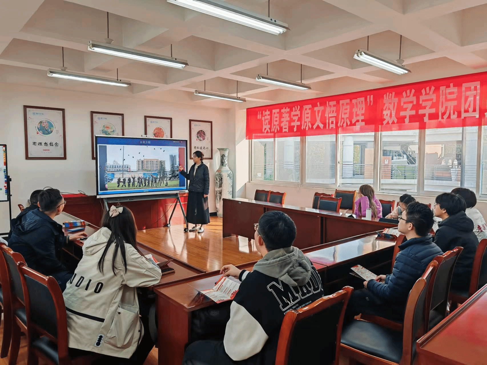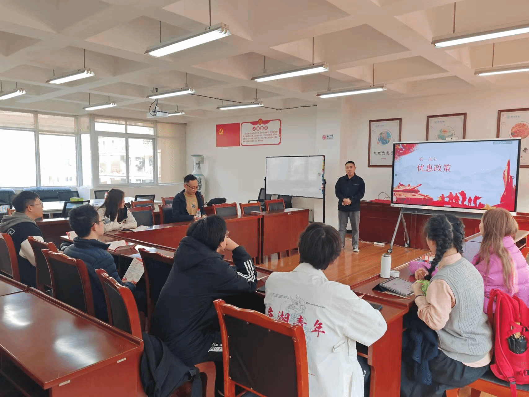 周杨翔谈到两年入伍生涯使他更加自信、自律、自强,完成了成长蜕变,还详细介绍了大学生应征入伍后在经济待遇、保研、考研、转专业等方面能够享受到的优待政策杨稀雯谈到入伍两年感受到奉献的意义和自我价值的实现,分享了个人的入伍动机、当兵体会、经济补助和学校政策。闫开龙老师同学们普遍关注的入伍去向、体检、流程等问题进行答疑进一步加强了同学们对应征入伍的了解。