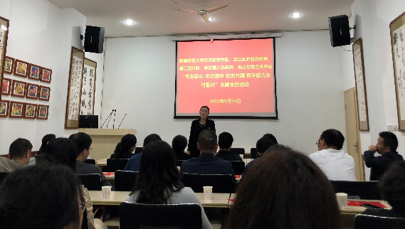 温江区妇女联合会主席石秀蓉作欢迎致词,全体党员深情合唱《我和我的祖国》,用歌声迎接新中国成立70周年。岷江村党支部书记陶勋花与师生党员分享作为全国人大代表和农村党支部书记履职尽职的经历,讲述了支部如何带领全村党员贯彻乡村振兴战略的奋斗故事。学院教师党支部书记张清邦带领大家重温入党誓词,向参会党员介绍了学院推进“不忘初心、牢记使命”主题教育举措和进展,鼓励学生党员心有大我、学以报国,号召教师党员当潜心问道、弘学育才,师生党员守初心、担使命、找差距、抓落实,共同推进中国特色世界一流学科建设。师生党员还参观了九坊墅宿、指尖生活馆和微盆景制作工坊,亲身体验乡村振兴带来的农村新面貌。