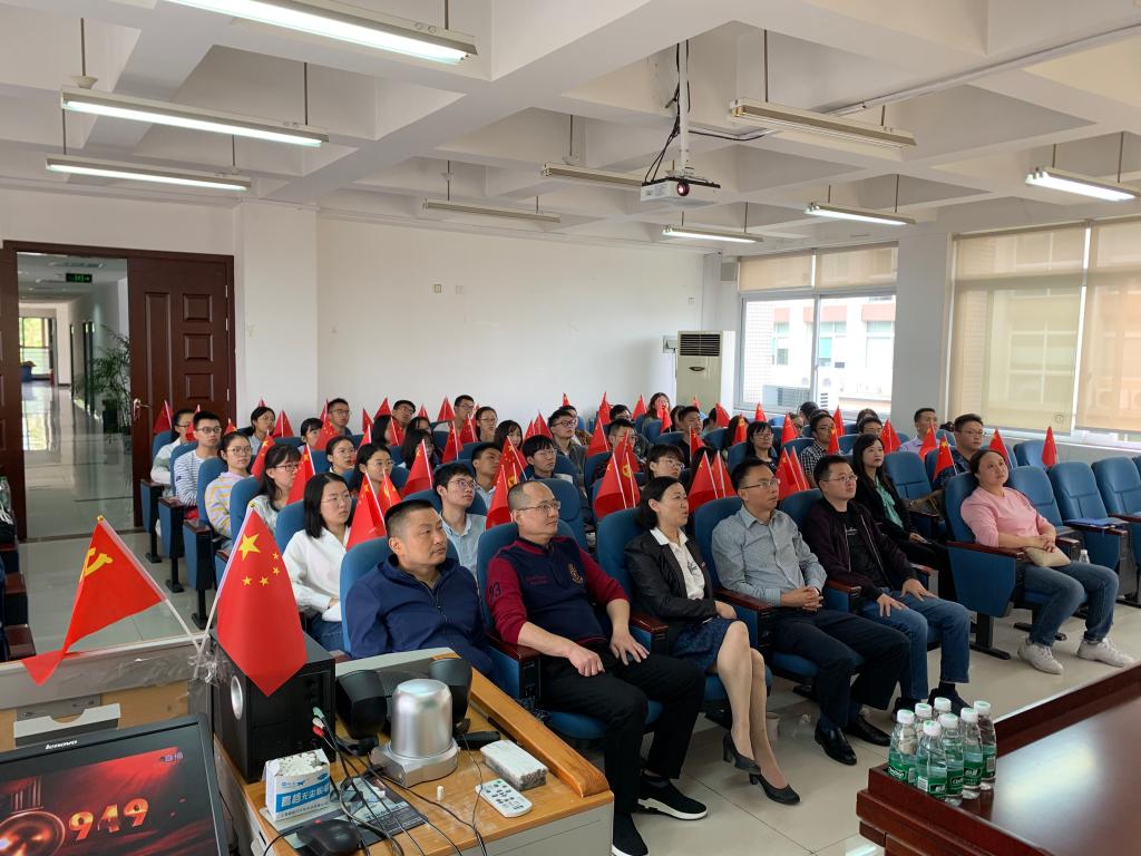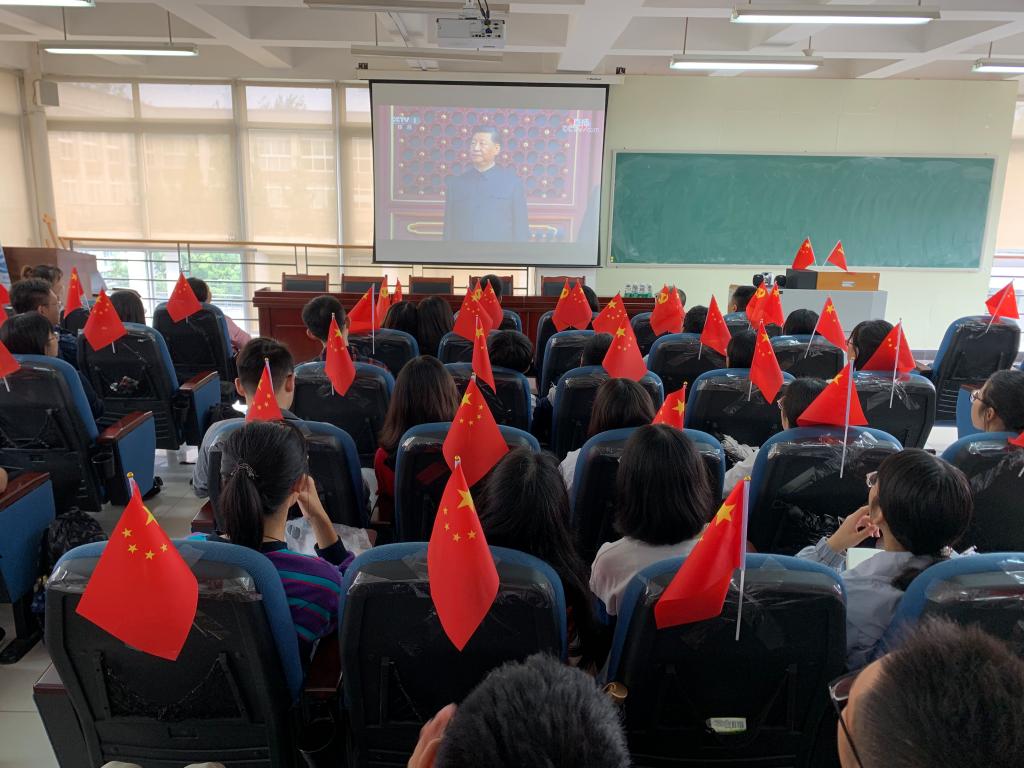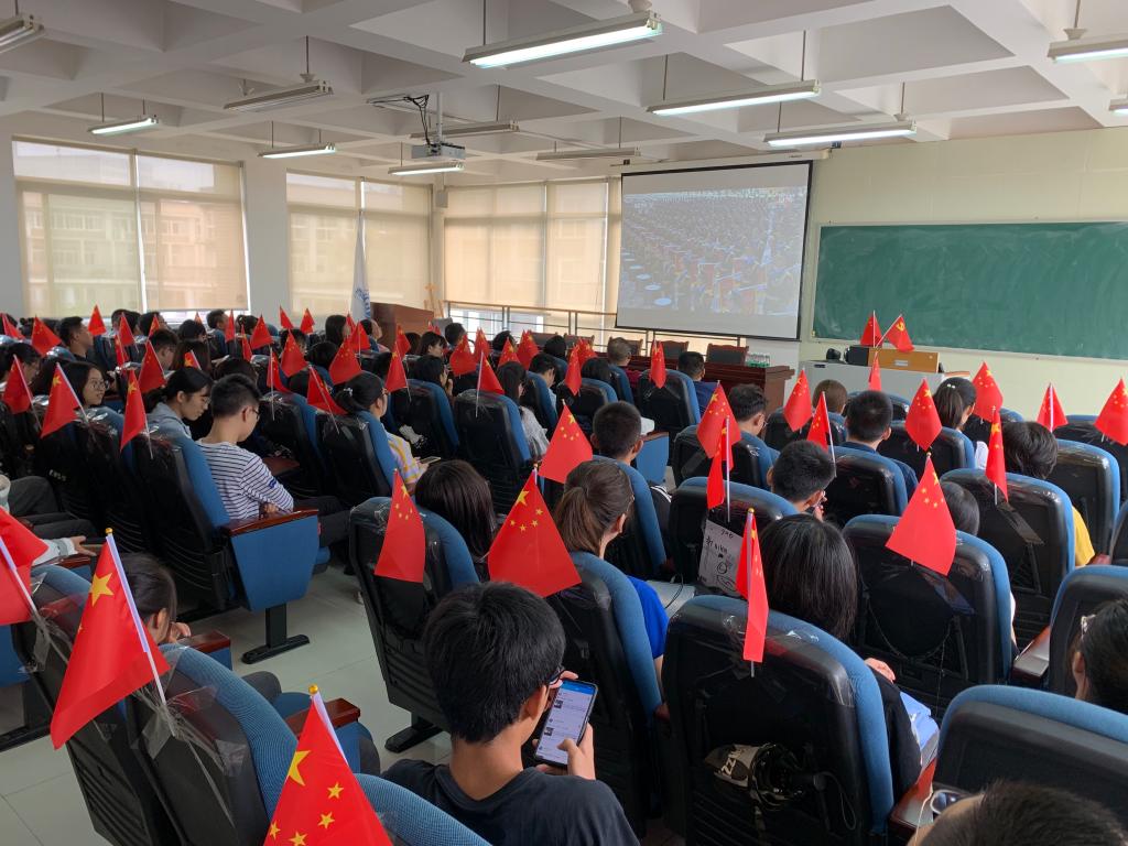 早上9点,学院师生就怀着激动的心情集中到通博楼B412会议室,用党旗和国旗精心布置的会议室,映衬出大家无比喜悦的心情。大家认真聆听习近平总书记在庆祝中华人民共和国成立70周年大会上的讲话,为我们伟大的中华人民共和国、伟大的中国共产党和伟大的中国人民倍感自豪,为我们伟大的祖国母亲送上衷心祝福。令人激动的阅兵仪式中,15个徒步方队英姿飒爽地迈着整齐的步伐走过天安门广场、32个装备精良的装备方队意气风发的接受党和人民的检阅、12个技术精湛的空中梯队厘秒不差的彰显出威武之师的严谨和精准,让师生们感受到大国的磅礴力量!随后的群众游行和庆祝活动,更展示了70年来全国各族人民同心同德、艰苦奋斗的精神风貌,团结的力量让今日中国取得了令世界刮目相看的伟大成就,今天,社会主义中国巍然屹立在世界东方,没有任何力量能够撼动我们伟大祖国的地位,没有任何力量能够阻挡中国人民和中华民族的前进步伐。