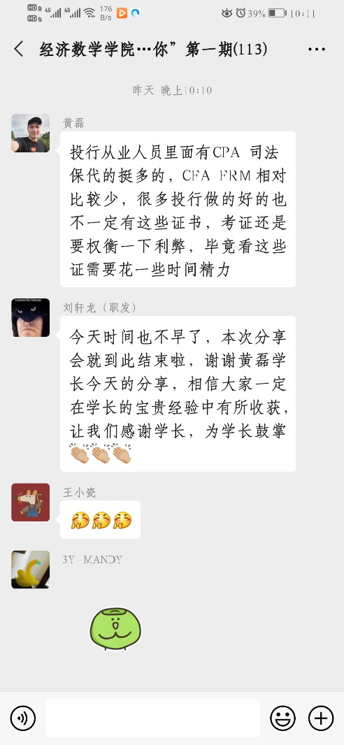 本次讲座主要分四个部分。第一个部分是投行进入的门槛、工作内容以及晋升途径。学长针对应届生从“学历、投行实习经历、证书”三个方面讲了投行门槛,还详细介绍了投行主要业务类型。第二个部分是投行从业人员的素质要求及如何准备。分别强调了专业知识、学习能力以及持续学习能力、人际交往能力。第三个部分是学长分享的一些从业实操的案例故事和项目经验。最后一部分是黄磊学长在线答疑,同学们积极与学长互动,黄磊学长为我们解答了“怎么样找实习?在什么时段做什么样的准备?在校学习的知识是否能在实际工作中应用?数理金融学知识与哪些岗位中对口?”等典型问题。其他方面学长推荐了相关证书以及如何看待考证书、考研与就业的经验。
