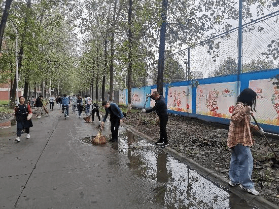 当天下午三点三十分,同学们在指定地点领取好卫生工具,热情满满地到达劳动实践地点——篮球场和排球场旁道路。樊书记和邹先云老师提前来到了实践地点,率先垂范,带领同学们投入到热火朝天的劳动中,一同体验劳动的苦乐。