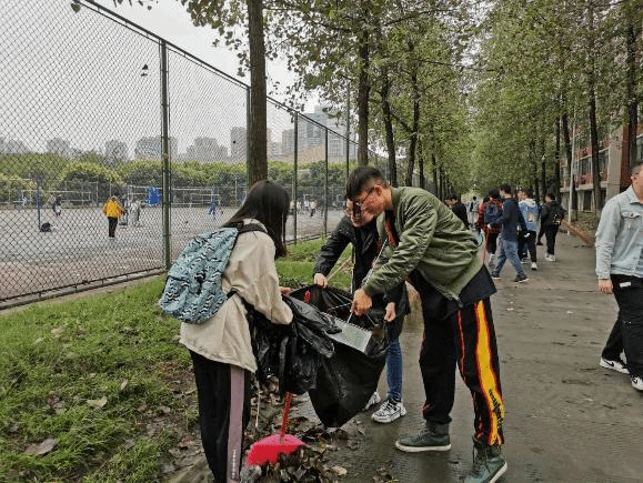 按照分组,同学们将工作分为扫地、清扫两旁落叶和设备清洁几项。由于连续下雨几日,道路旁积水较多,这也增加了大家清扫落叶的难度。但这一切丝毫没有影响老师和同学们的热情,老师和同学们都戴上了手套,将难以清扫的落叶拾入垃圾袋中。大家分工明确、配合默契、各就其位,不忽略任何一个角落。经过一个小时的清理,整条道路清爽洁净,焕然一新。