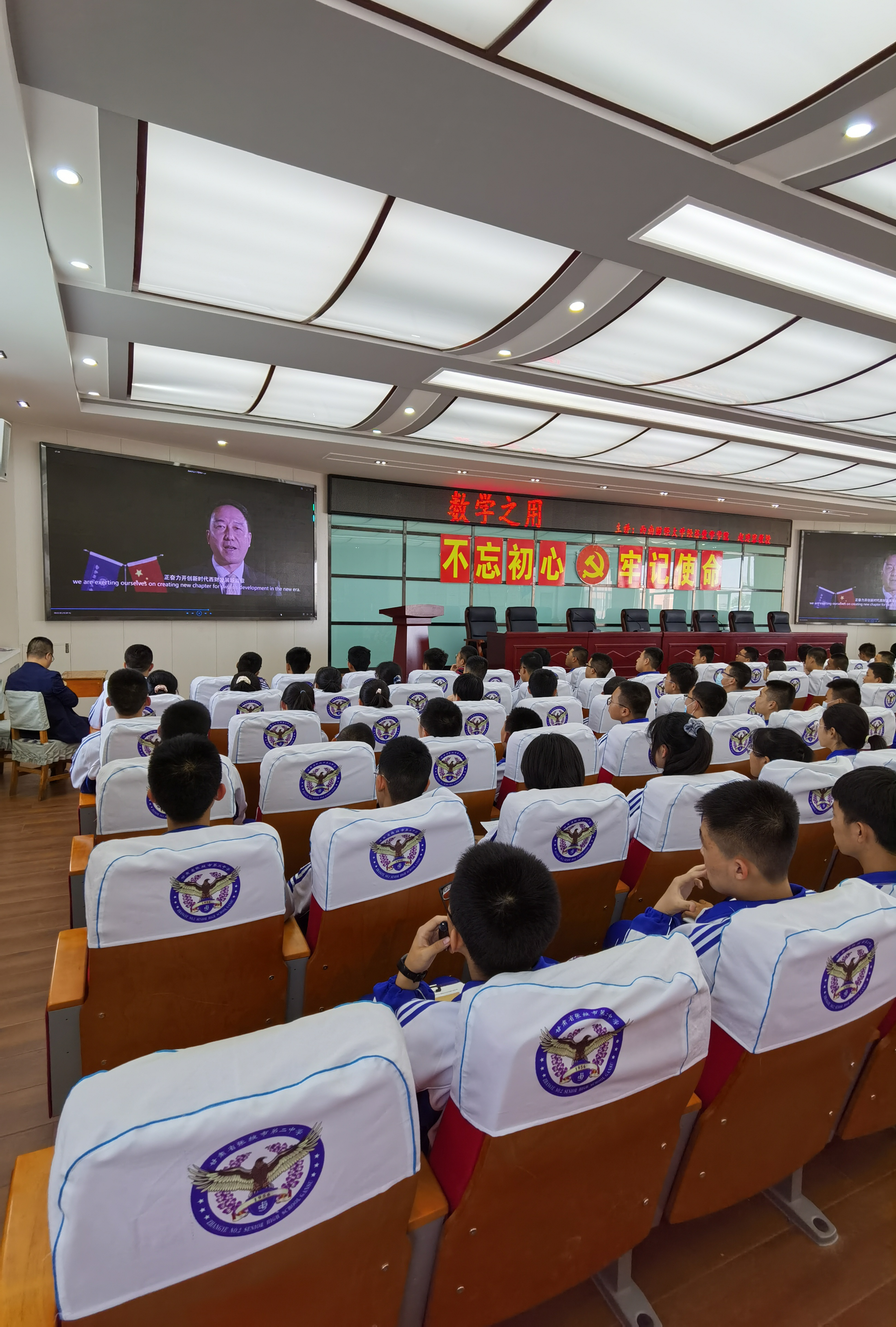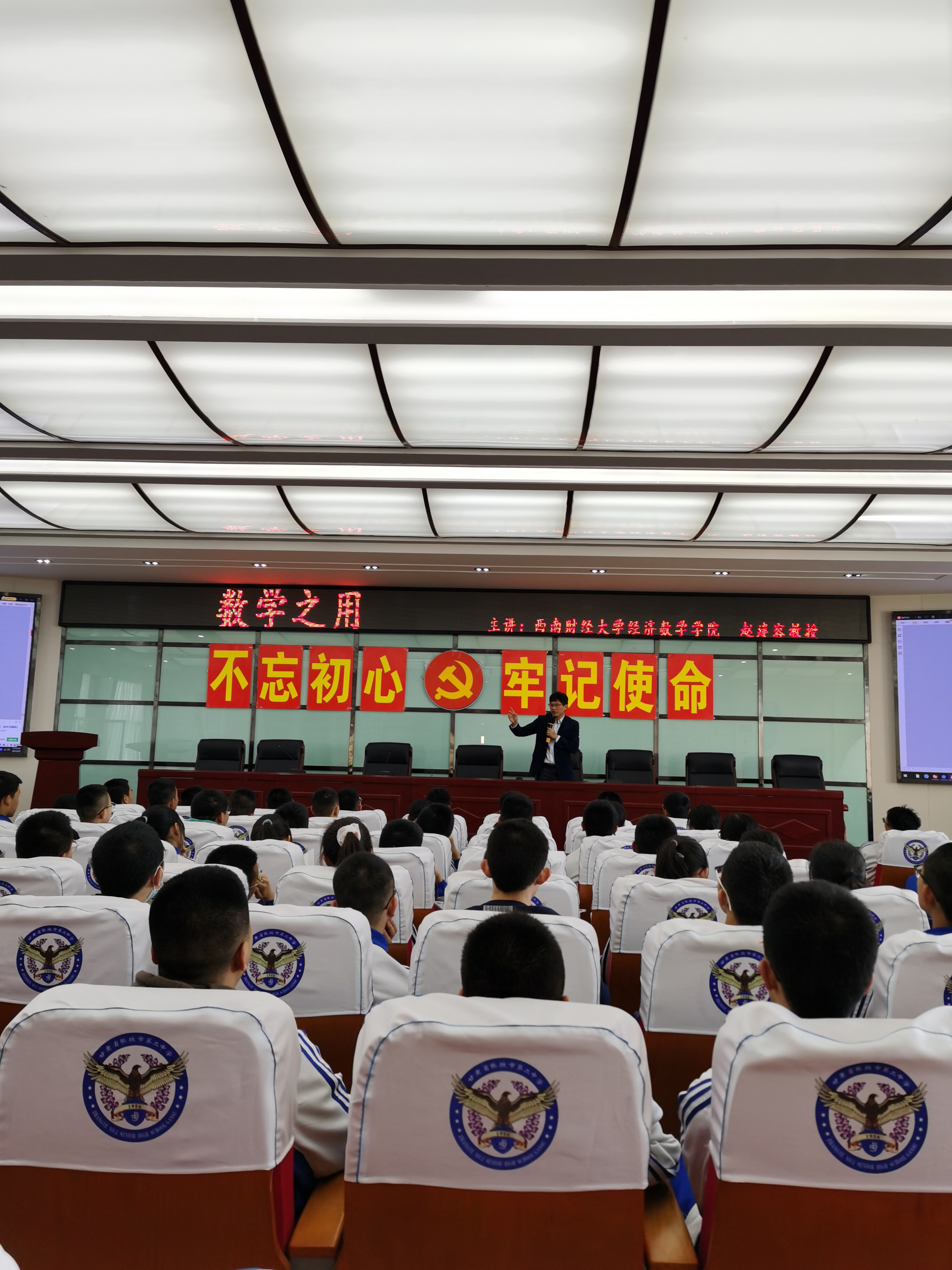 5月7日,招生宣传小组人员赴张掖第二中学举行新葡的京集团8814vip“优质生源基地”签约挂牌仪式。仪式上,中学师生一起观看了新葡的京集团8814vip宣传片,随后,赵建容教授为高一、高二学子做了题为《数学之用》的讲座。