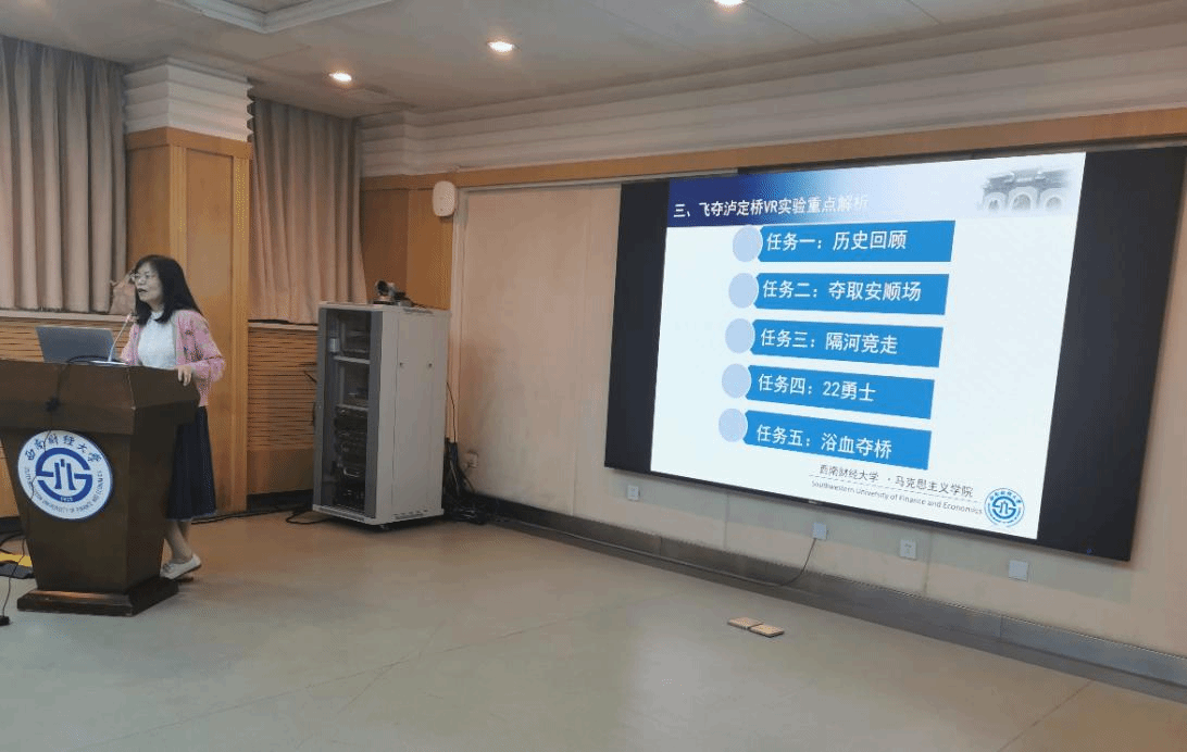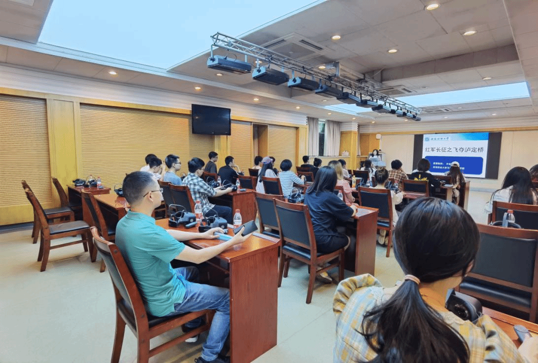 马克思主义学院李春梅教授首先介绍了红军长征之飞夺泸定桥的历史背景,历史意义与时代价值,详细地为同学们介绍了“飞夺泸定桥”战略决策过程、战时兵力部署、敌我战术较量、夺桥勇士组成、武器装备选择等。随后在红军“飞夺泸定桥”虚拟仿真实验教学项目中,让师生通过创设的虚拟仿真实验环境,围绕“夺取安顺场”、“隔河竞走”、“22勇士”和“浴血夺桥”等历史场景,感受革命先辈们忠诚坚定的理想和英勇顽强的精神。