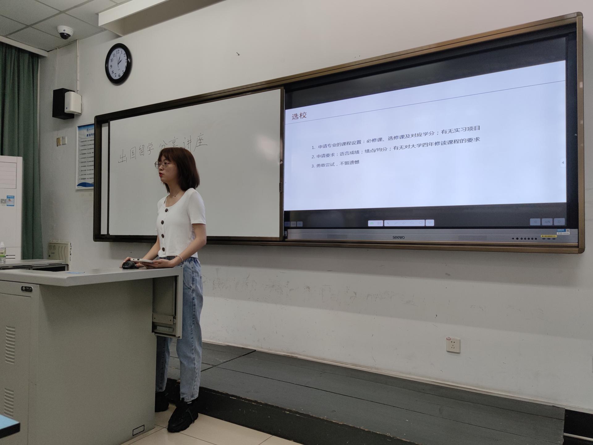 讲座中,两位主讲人就自己成功申请留学的经历同大家进行了详细的分享。首先,王雨薇同学为大家详细讲解了留学申请的整个过程,强调了在学校专业选择、申请文书制作以及材料投递时间等方面需要注意的地方。在学校专业选择上,王雨薇同学提出要提前了解各海外大学的专业课程设置,并将其对绩点、语言成绩、实习、科研等方面的要求同自身条件进行比较,在此基础上做出选择;在申请文书方面,王雨薇同学强调要按相关要求准备齐全,并针对不同的学校专业准备不同的申请文书。夏潇湘同学则着重说明了早规划和早申请的重要性。在早规划上,夏潇湘同学认为在不同的时间段要做好相应的准备,从学业、比赛、实习等方面使自己在留学申请上更具有竞争力。在早申请上,夏潇湘同学提到一般越早申请国外的大学,竞争越小。最后,两位同学也对大家提出的问题进行了详尽的解答,并以“昨日种种,皆成今我”鼓励同学们努力追求自己的留学梦想。