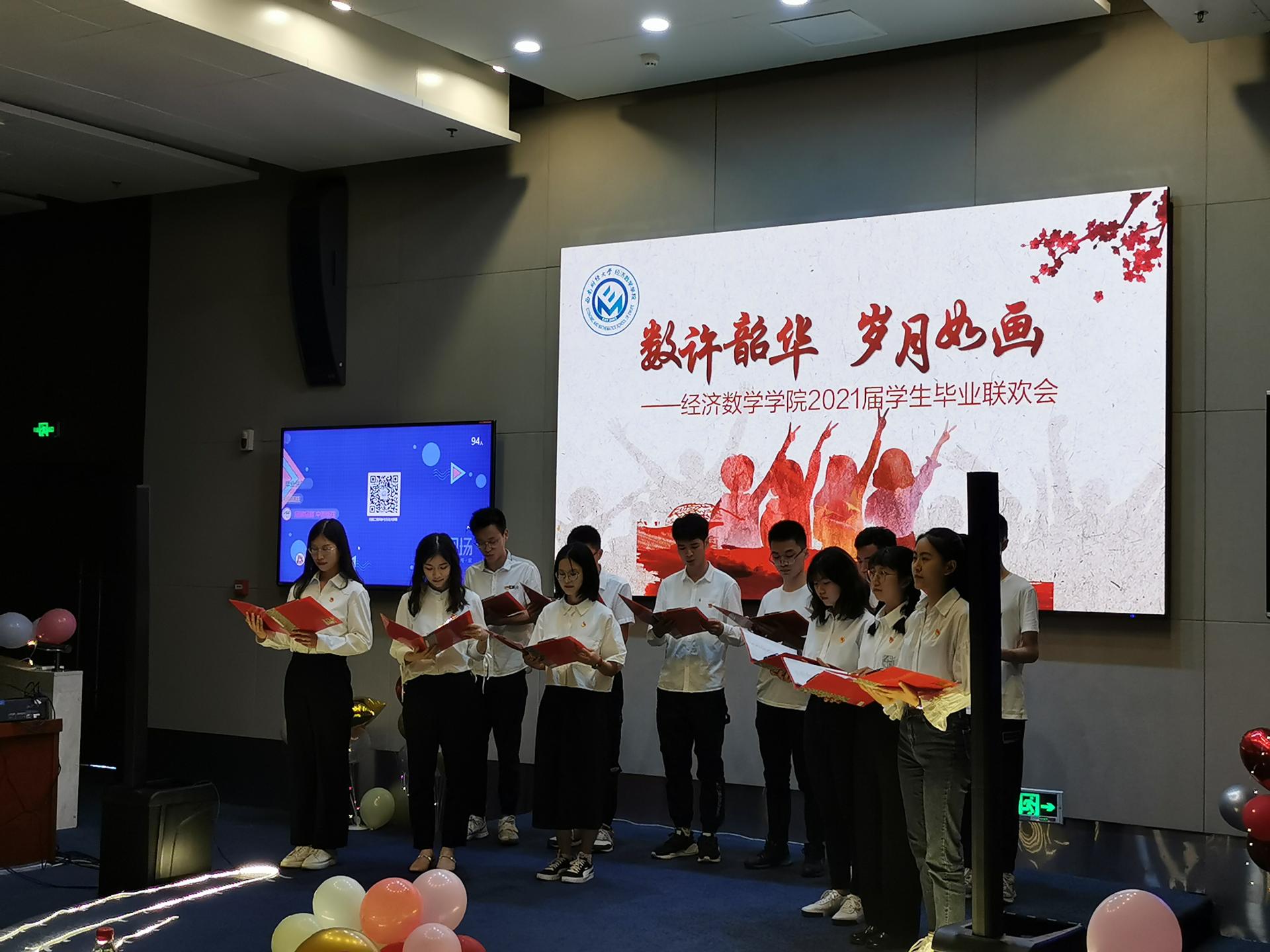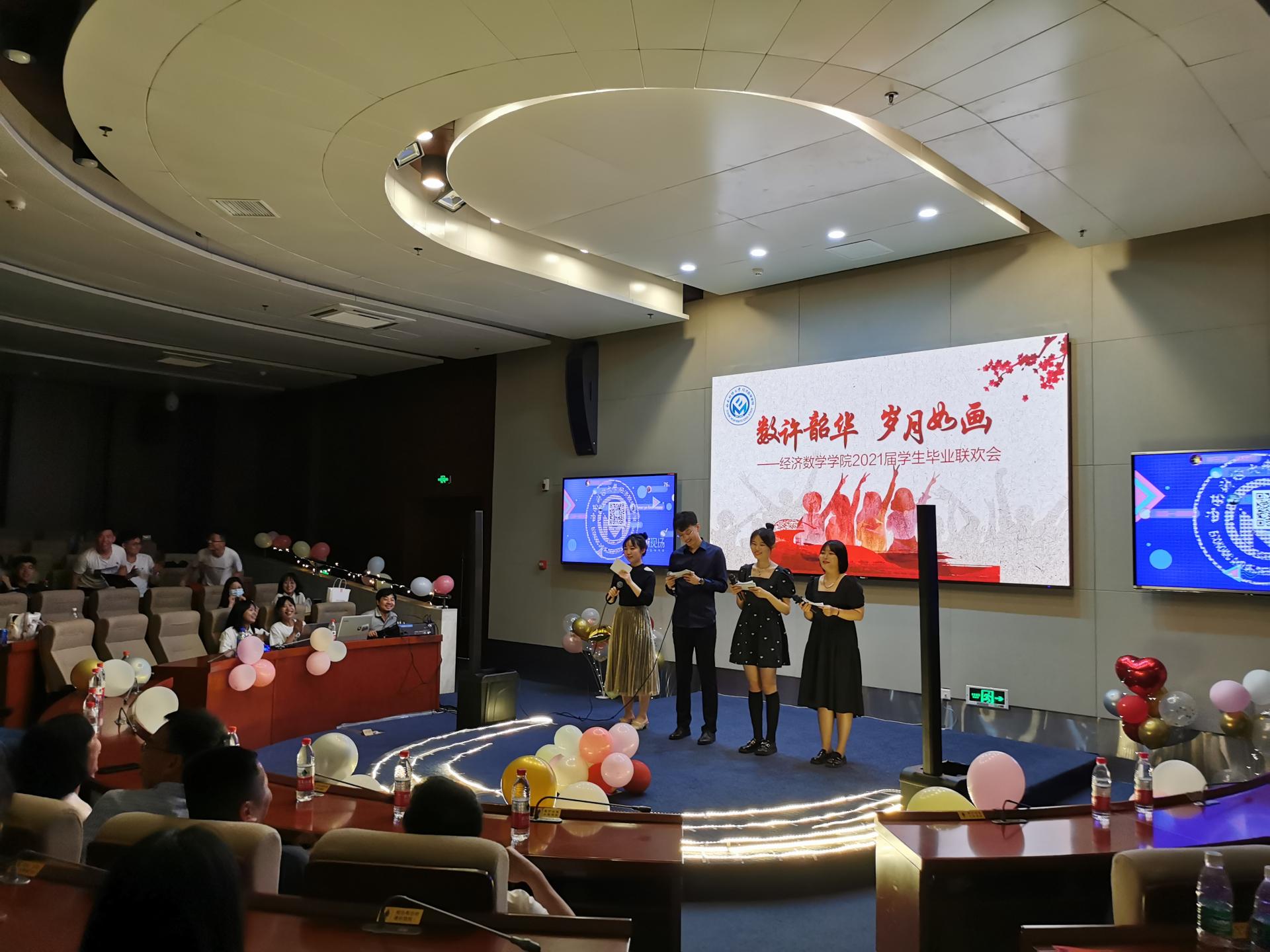 马敬堂院长代表学院向同学们表达了美好的祝愿和殷切的期望,希望同学们继续奋斗,拥有更加灿烂美好的未来。联欢会以经济新葡的京集团8814vip学生党员代表们的诗朗诵《信念永恒》拉开帷幕,为建党百年献礼。接下来一曲合唱《西财柳林的日子》表达了同学们对母校的感恩与怀念。紧接着一首热血澎湃的诗朗诵《青春中国》则表达了同学们对祖国的热爱和对革命先辈的赞颂。多才多艺的毕业生同学们带来了精彩歌舞表演,获得台下观众连连掌声和喝彩。此外学院王琪教授和2018级数学与应用数学的唐颂同学也分别献唱歌曲《祝福》和《一路向北》,表达了对2017级毕业生的真诚祝福。联欢会最后,作为2017级毕业生大学四年的见证人,2017级辅导员邹先云老师上台致辞,谆谆教诲让同学们永生难忘。