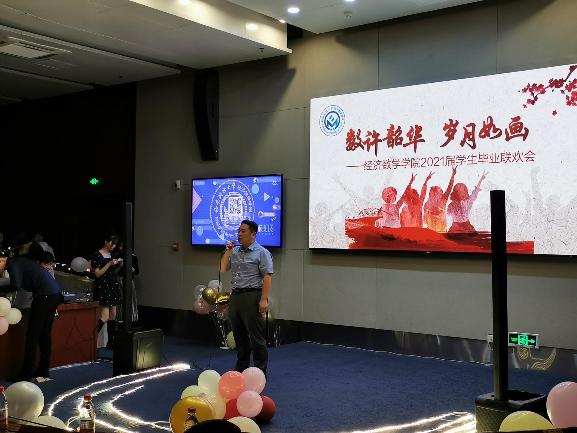 此次联欢会穿插了共五轮互动抽奖和四轮游戏环节,增加了现场观众的参与感,大屏幕上不断出现的“毕业快乐”和“经数经数,中流砥柱”互动弹幕也展现出同学们对学院真挚的情感。