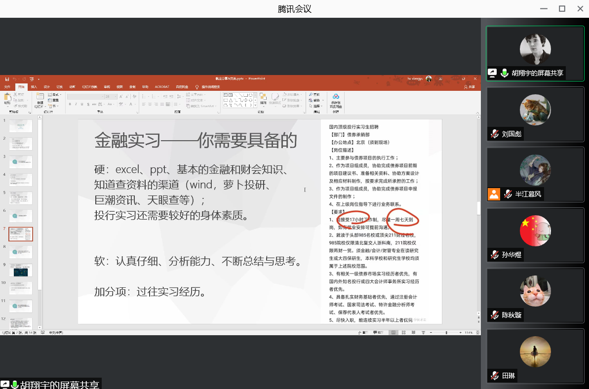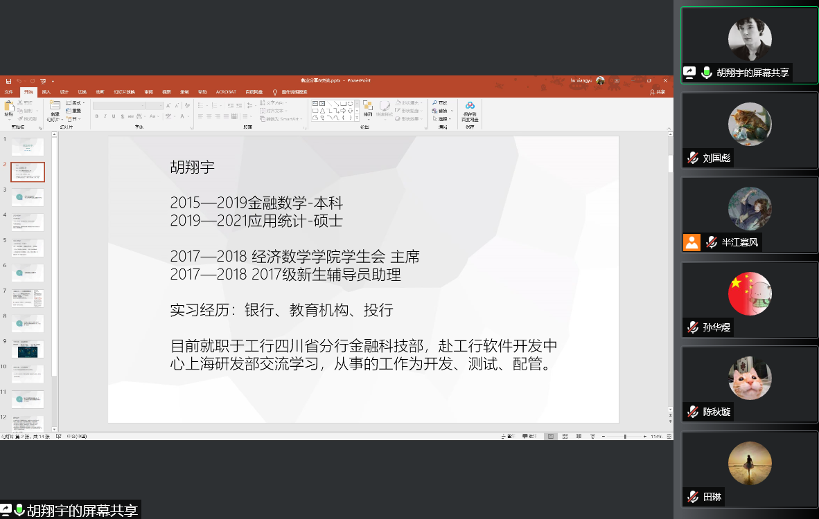 为更好的优化人才培养方案,增加同学们了解市场需求的了解,增加求职竞争力,经济新葡的京集团8814vip自2020年起开展“职因有你”系列学生职业生涯类的讲座、交流座谈会类活动。2021年10月30日,邀请到了就目前职于四川省工商银行的胡翔宇、李逸凡、孙华煜、刘之豪、熊欣宇、奉雪六位优秀毕业生开展了线上就业分享讲座。针对在校学生了解自身想从事行业的行业动态,岗位要求及其职业发展路径做出了指导。