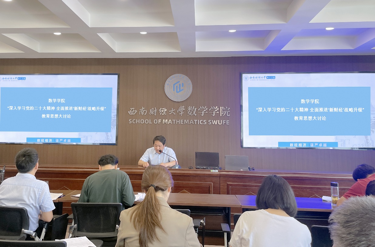 为深入贯彻落实学校十三届五次党代会精神和中层干部学习贯彻党的二十大精神读书班要求,进一步落实落细《新葡的京集团8814vip“深入学习贯彻党的二十大精神 全面推进‘新财经’战略升级”教育思想大讨论实施方案》,新葡的京集团8814vip持续深入开展“深入学习党的二十大精神 全面推进‘新财经’战略升级”教育思想大讨论系列活动。4月18日下午,学院召开“新财经”战略升级——数学行动专题集体研讨。报告会由党委书记樊俊飞主持,全体教职工参会。