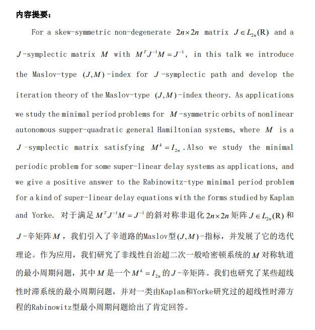 主题:Minimal symmetric Periodic Solutions of General Hamiltonian Systems and Delay Differential Equations一般哈密顿系统和时滞微分方程的极小对称周期解