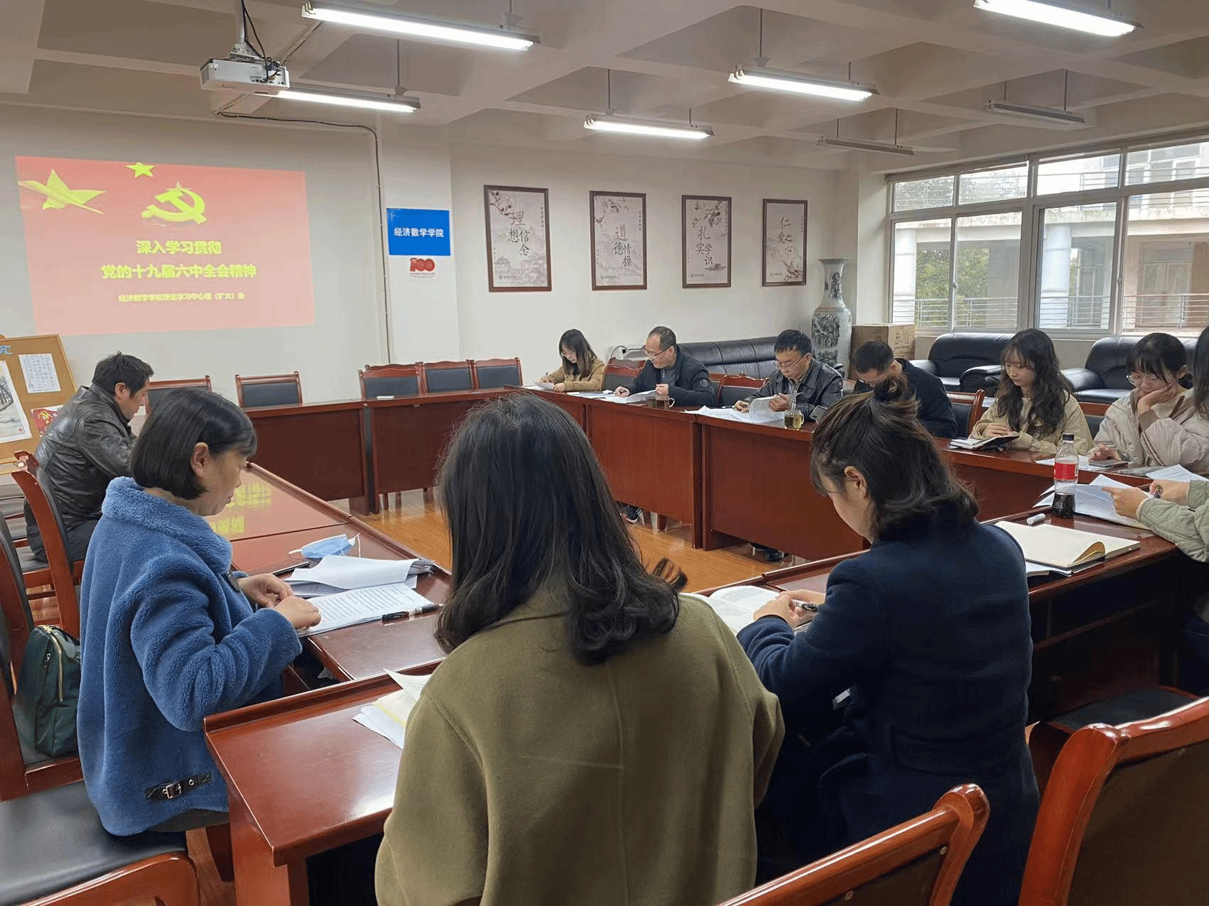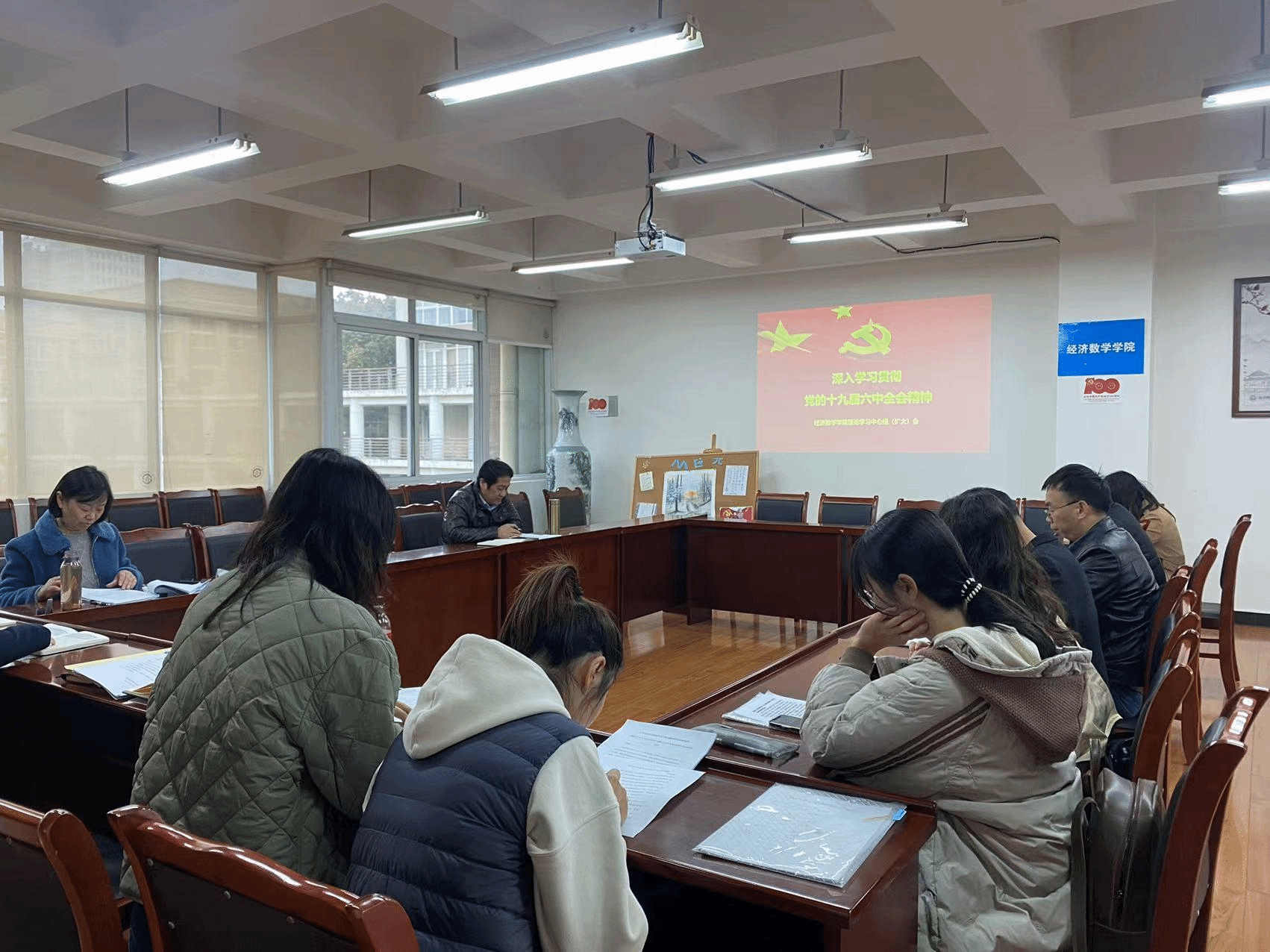 11月18日下午,学院党委在通博楼312会议室召开理论学习中心组学习(扩大)会,专题学习党的十九届六中全会精神,深入领会《中国共产党第十九届中央委员会第六次全体会议公报》《关于< 中共中央关于党的百年奋斗重大成就和历史经验的决议>的说明》。学院党委中心组成员参加会议,教职工代表、行政教辅代表、学生代表列席会议。根据学院安排,由党委副书记樊俊飞主持会议并作领学。