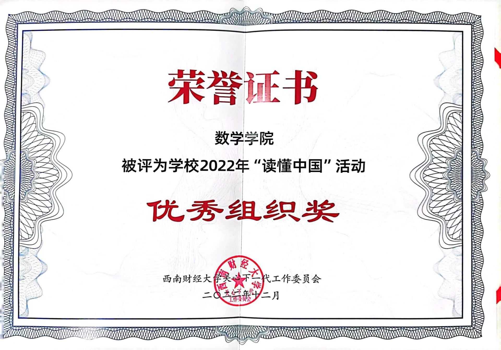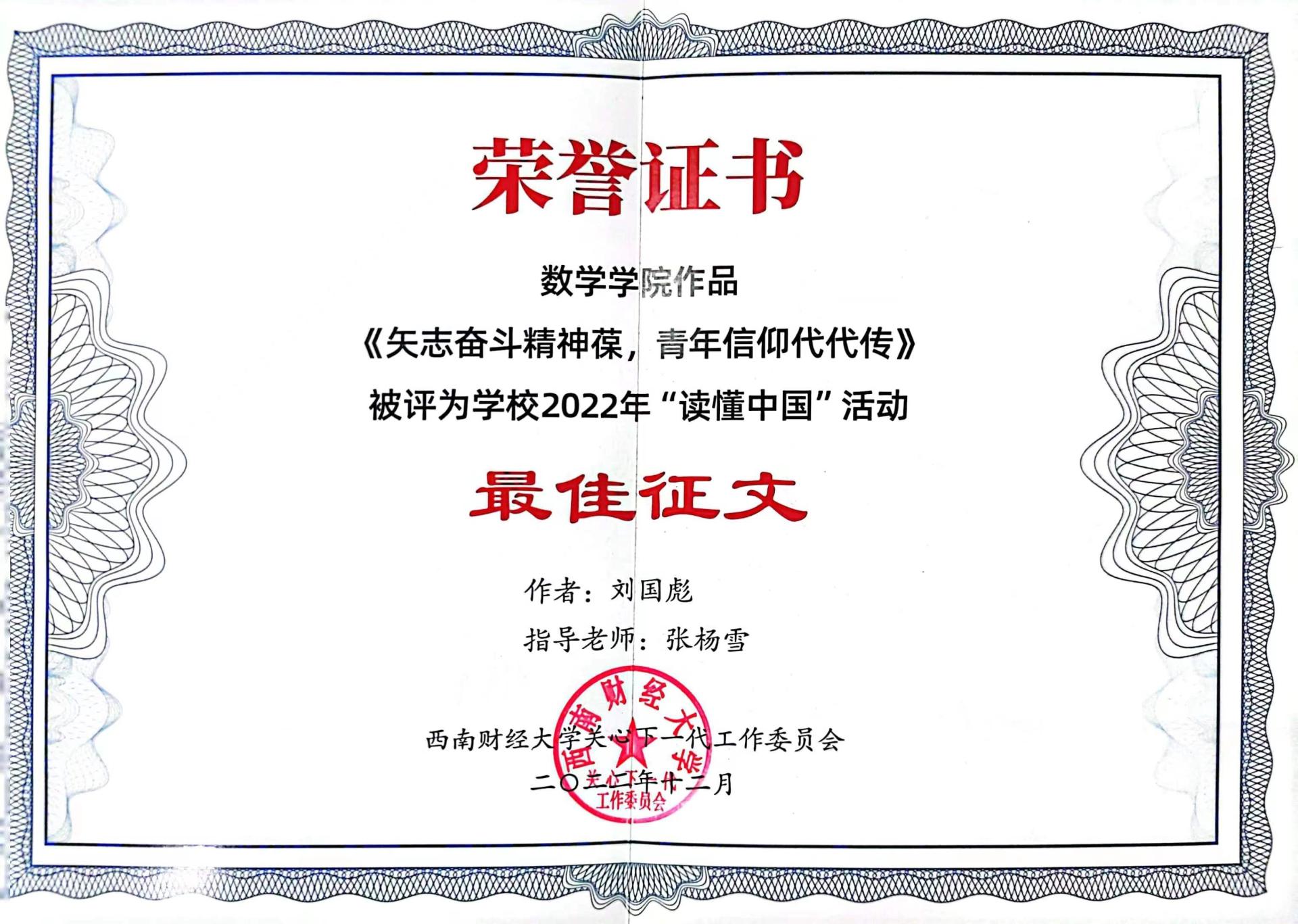 3月9日上午,学校在光华校区住友苑隆重召开关心下一代工作委员会换届大会,并对2022年“读懂中国”活动获奖学生和集体进行表彰。我院学生征文作品《矢志奋斗精神葆,青年信仰代代传》(作者:刘国彪,指导教师:张杨雪)获得学校2022年“读懂中国”活动最佳征文,同时,我院还获评学校2022年“读懂中国”活动优秀组织奖。