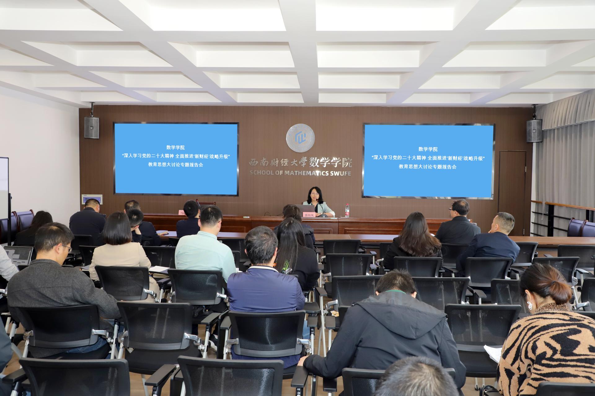 为深入贯彻落实学校十三届五次党代会精神和中层干部学习贯彻党的二十大精神读书班要求,进一步落实落细《新葡的京集团8814vip“深入学习贯彻党的二十大精神 全面推进‘新财经’战略升级”教育思想大讨论实施方案》,4月4日下午,新葡的京集团8814vip在通博楼B412会议室召开“深入学习党的二十大精神全面推进‘新财经’战略升级”教育思想大讨论专题辅导报告会,组织人事部部长谢红,金融学院教授、博士生导师郭海凤分别做辅导报告,全体教职工参加。报告会分别由学院党委书记樊俊飞、执行院长马敬堂主持。