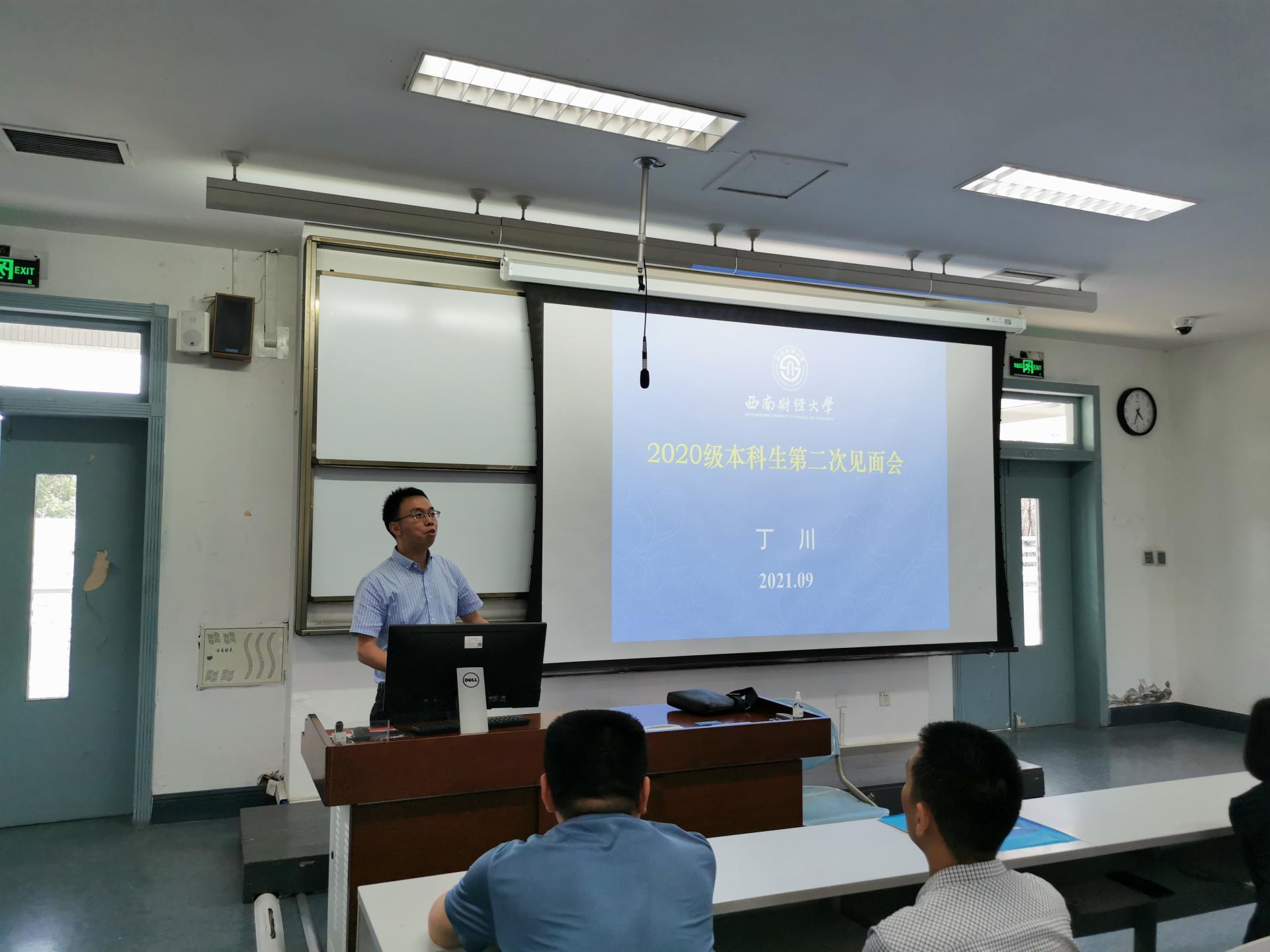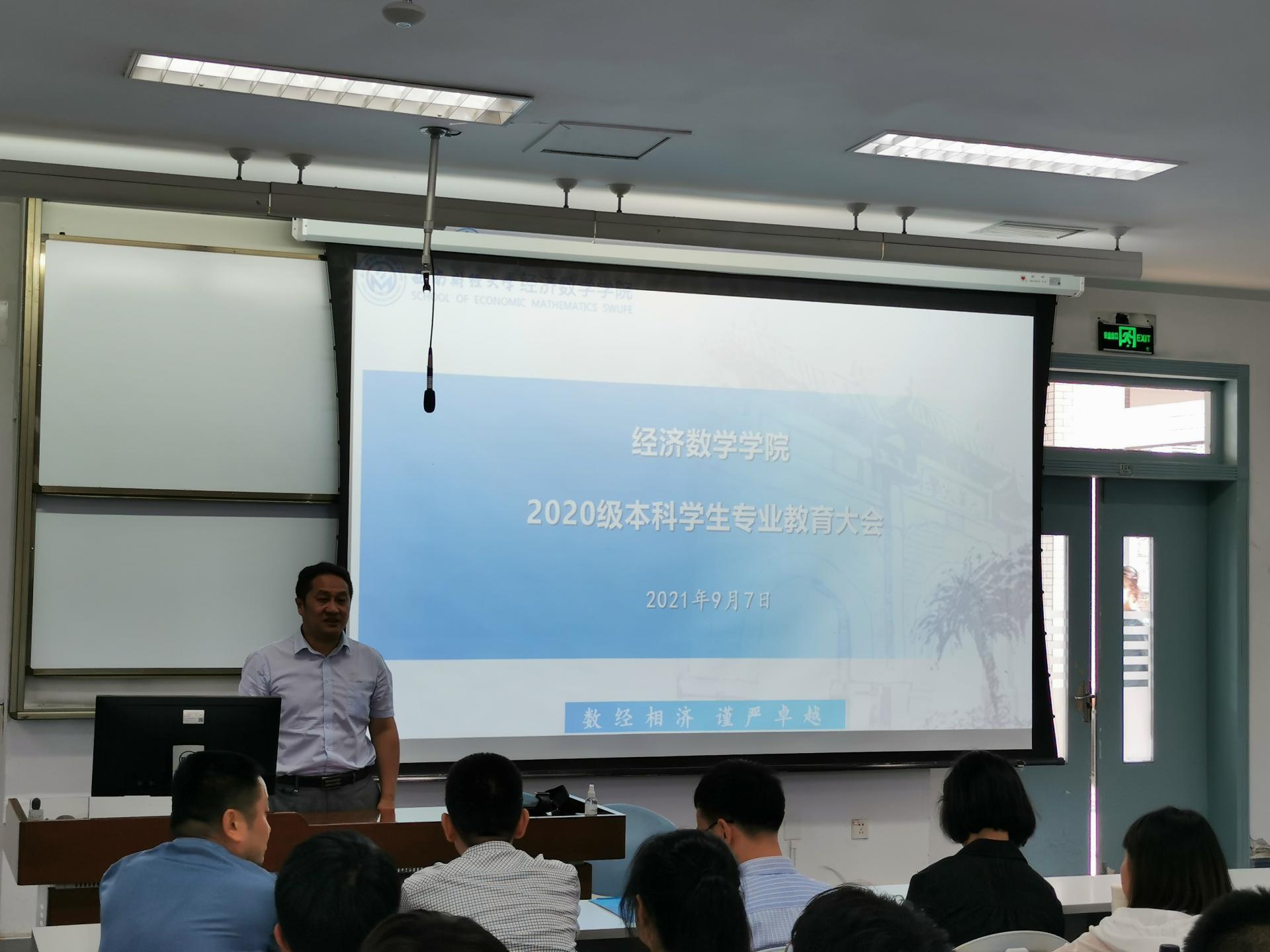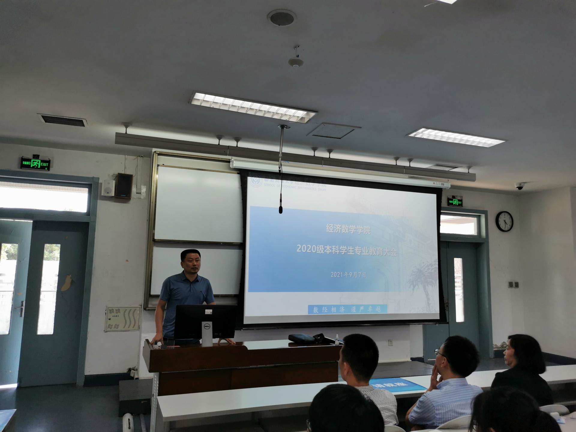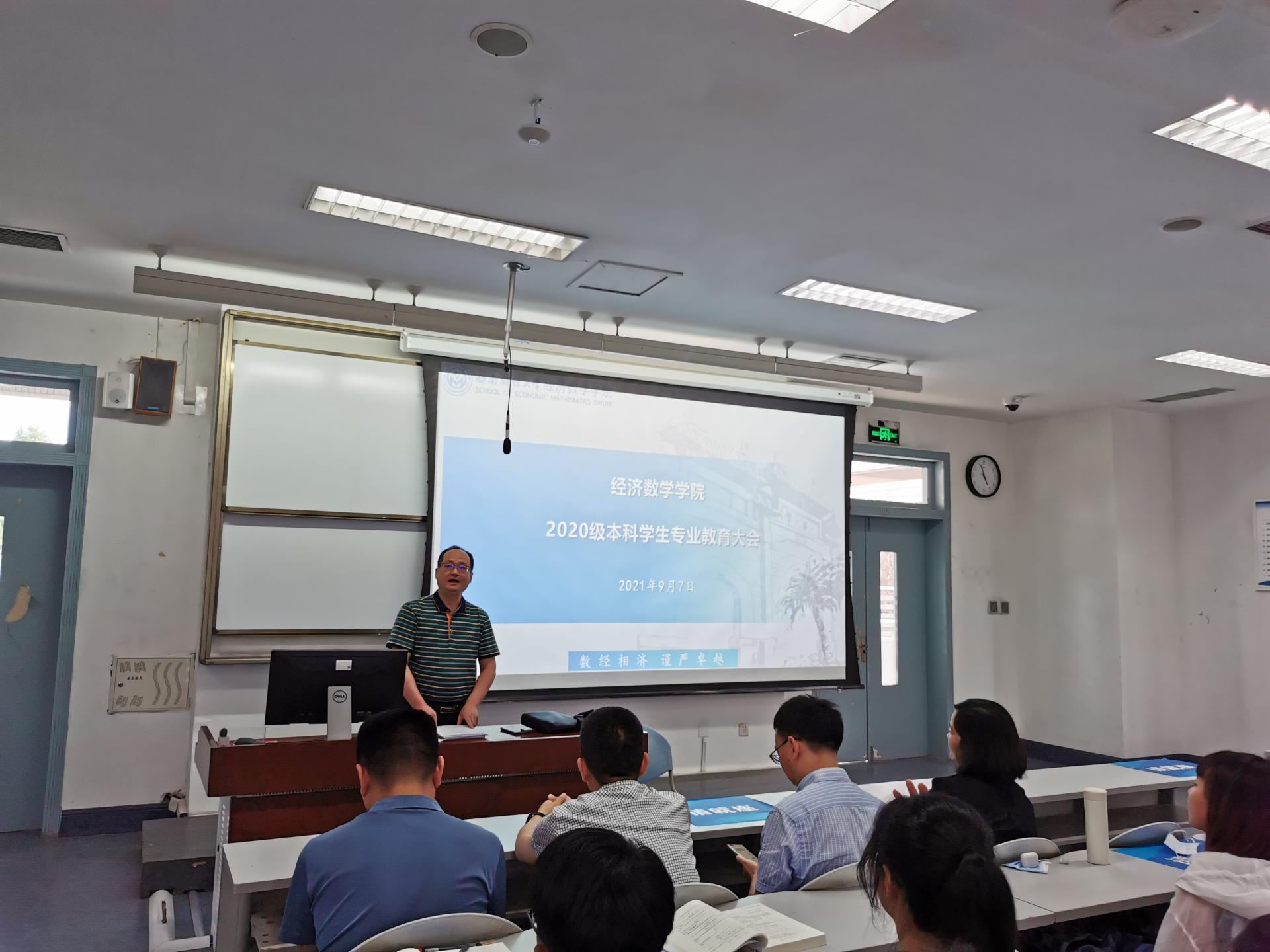 2021年9月7日下午4点,经济新葡的京集团8814vip在经世楼F201举行2020级本科学生专业教育大会,经济新葡的京集团8814vip分党委书记陈茵茵、院长马敬堂、副书记樊俊飞、副院长李绍文、副院长丁川、应用数学系方敏、金融数学系主任张清邦,以及全体专业班主任老师参加了此次会议,会议由2020级辅导员邹先云主持。