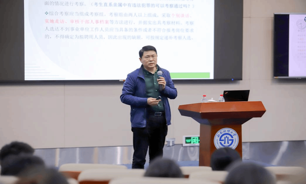 为增强学生对行业的认知和提升学生就业能力,3月20日晚,我院联合财政税务学院、计算机与人工智能学院、外国语学院、马克思主义学院在弘远楼101举办题为“事业单位招聘政策及面试解读”的专题讲座。本次讲座邀请到四川省人力资源和社会保障厅事业单位人事管理处副处长戴元章担任主讲嘉宾。