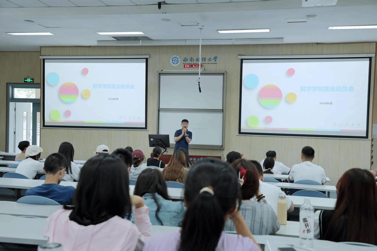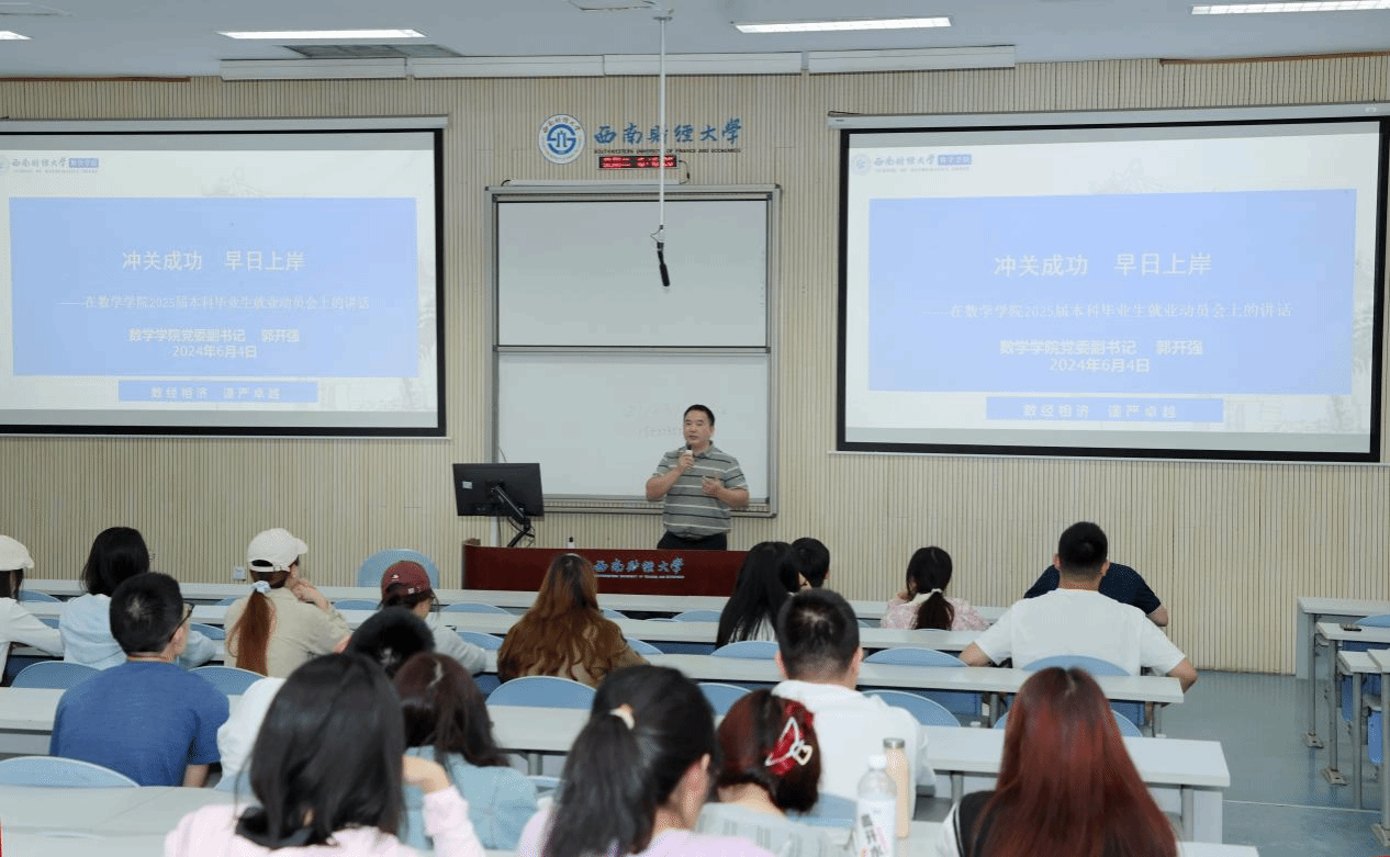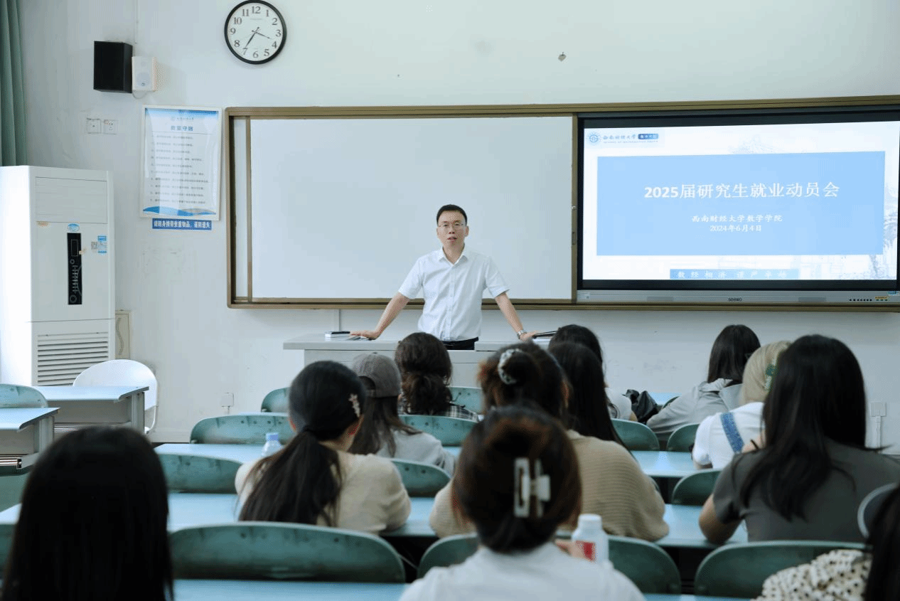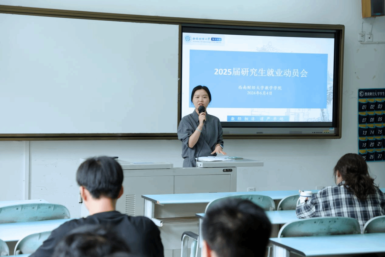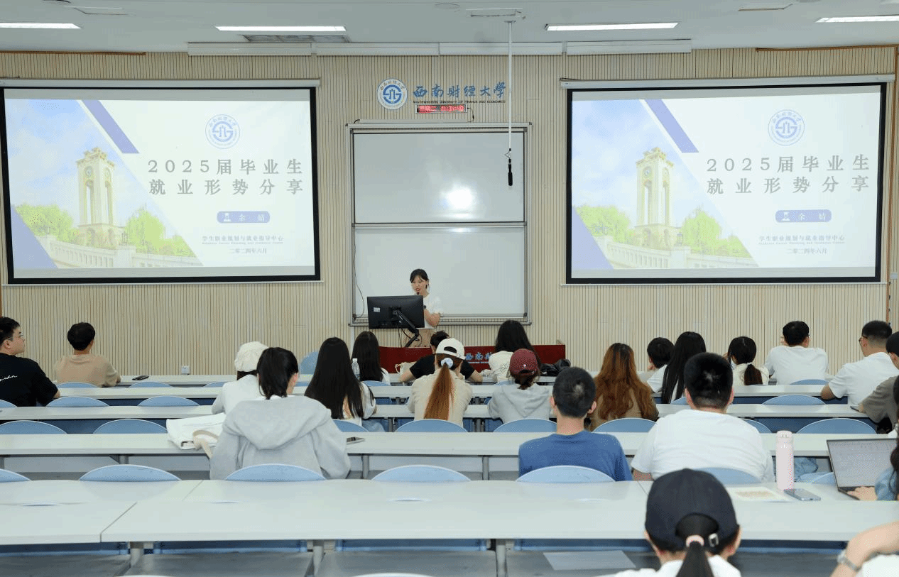 会上,学校学生职业规划与就业指导中心就业管理科科长余婧老师针对学院2025届毕业生开展了就业专题讲座。余婧首先指出,党中央、国务院高度重视就业工作,教育部、四川省人民政府均出台了相关就业政策,希望同学们高度重视就业的重要意义,早思考、早准备、早行动。她用详实的数据分析了我校毕业生的就业特点,国内外升学率“高”,世界500强企业入职比例“高”,金融行业就业比例“高”,定向选调生项目入选比例“高”,投身国家重大战略、服务区域发展比例“高”,同时,分析了学校毕业生就业区域和学校十大就业重镇。在前期分析基础上,余婧建议同学们要多渠道了解就业信息,要持续完善简历等求职材料,要紧扣岗位需求,突出人岗匹配度,提高面试效能。同时,需要警惕求职陷阱,提高求职防骗意识。最后,她详细介绍了学校提供的校园招聘服务、生涯咨询服务、困生帮扶与基层就业项目、就业指导服务、毕业生事务、“智慧就业”系统服务等就业服务信息,鼓励同学们积极尝试、把握机会,寻找适合自己的岗位。