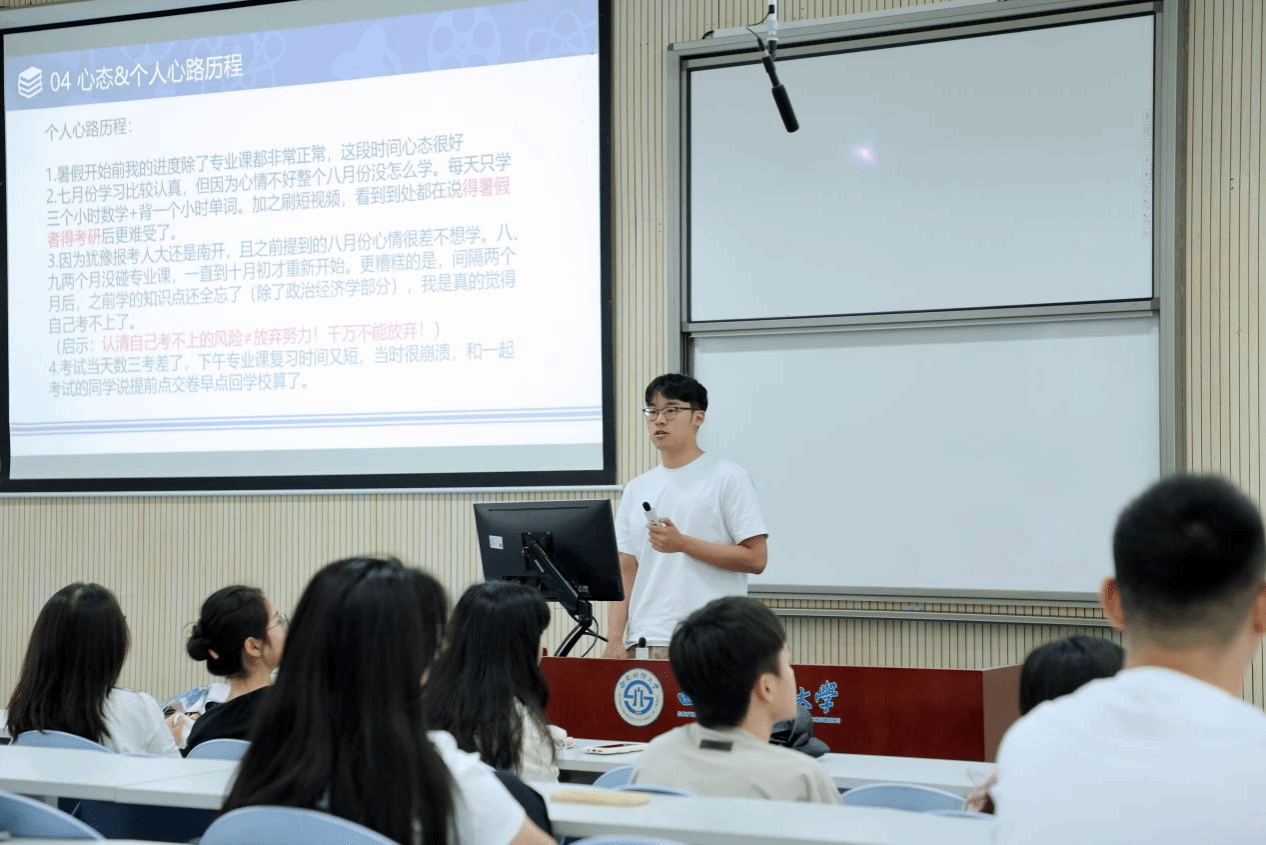 本科生专场在经世楼G102开展。学院邀请了来自2024届的数学与应用数学(金融数学创新实验班)王沁、数学与应用数学(经济数学方向)杨小英、数学与应用数学(经济数学方向)罗明扬、数学与应用数学(金融数学创新实验班)刘成彦等4位同学分别就就业、考研、考公、出国(境)留学等进行主题分享,为同学们提供经验参考。