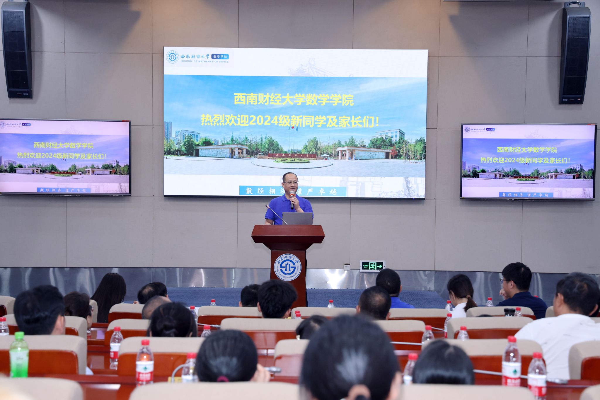 学院党委书记樊俊飞副教授向2024级新生及家长致以热烈祝贺和欢迎。他谈到,学院与家庭是人才培养的坚实伙伴,双方应紧密合作,共绘学生成长蓝图。学院一定不会辜负社会的重托和家长的信任,以强烈的责任感和使命感把学院办好、把学生培养好,为推进中国式现代化培养栋梁之才。他寄语同学们,要坚定理想信念,努力成长为堪当民族复兴伟业的时代新人;要砥砺品行,健全人格,努力成长为德智体美劳全面发展的社会主义建设者和接班人;要刻苦学习,勇毅拼搏,努力成长为勇攀科学高峰的新时代卓越数学人。