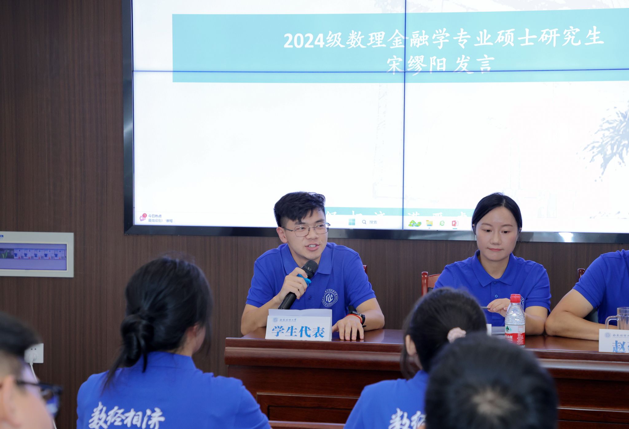 硕士新生宋缪阳、博士新生毕皓作为学生代表发言,表示将传承“经世济民、孜孜以求”的西财精神,遵循学院“数经相济,谨严卓越”的院训,做好学业规划,严守学术道德,努力在中国式现代化的新征程上展现青春作为、彰显青春风采。