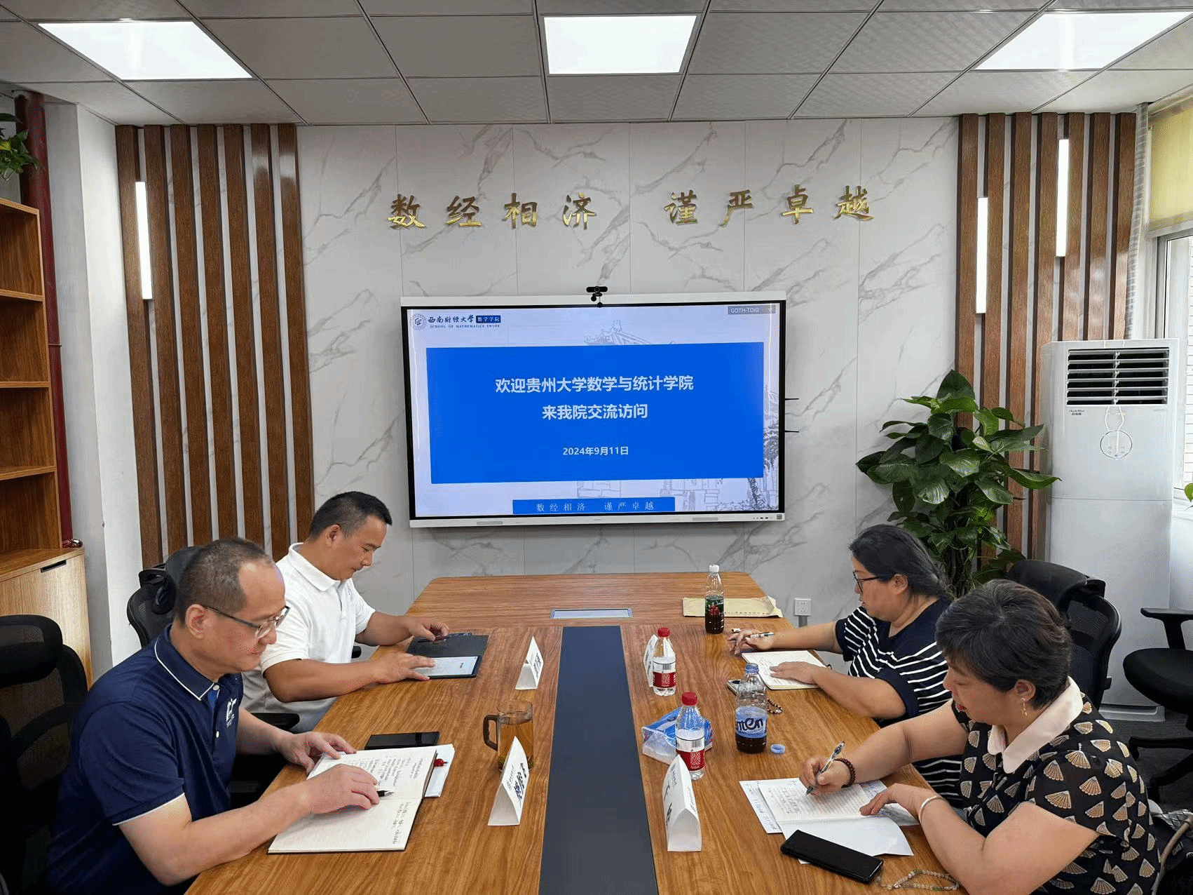 为加强院际之间交流互动,9月11日上午,贵州大学数学与统计学院党委书记于松、学生科科长何欣来我院进行调研座谈,我院党委书记樊俊飞、副书记郭开强参与座谈。