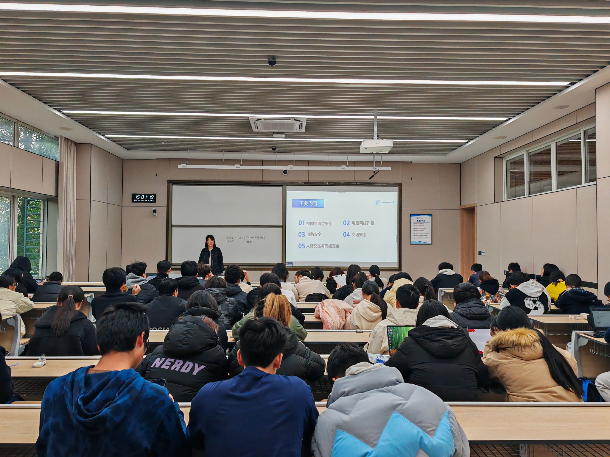 最后,在人际交往与网络安全环节,胡晓容提出了诸多有益建议,同学们应互相尊重、积极沟通、控制情绪,共同营造和谐的宿舍氛围。特别强调要杜绝偷窥、偷拍他人隐私等违法行为,遵守法律法规和道德规范。在网络使用方面,同学们要坚决抵制不良信息,不分享、不交流,做到文明上网、安全用网。
