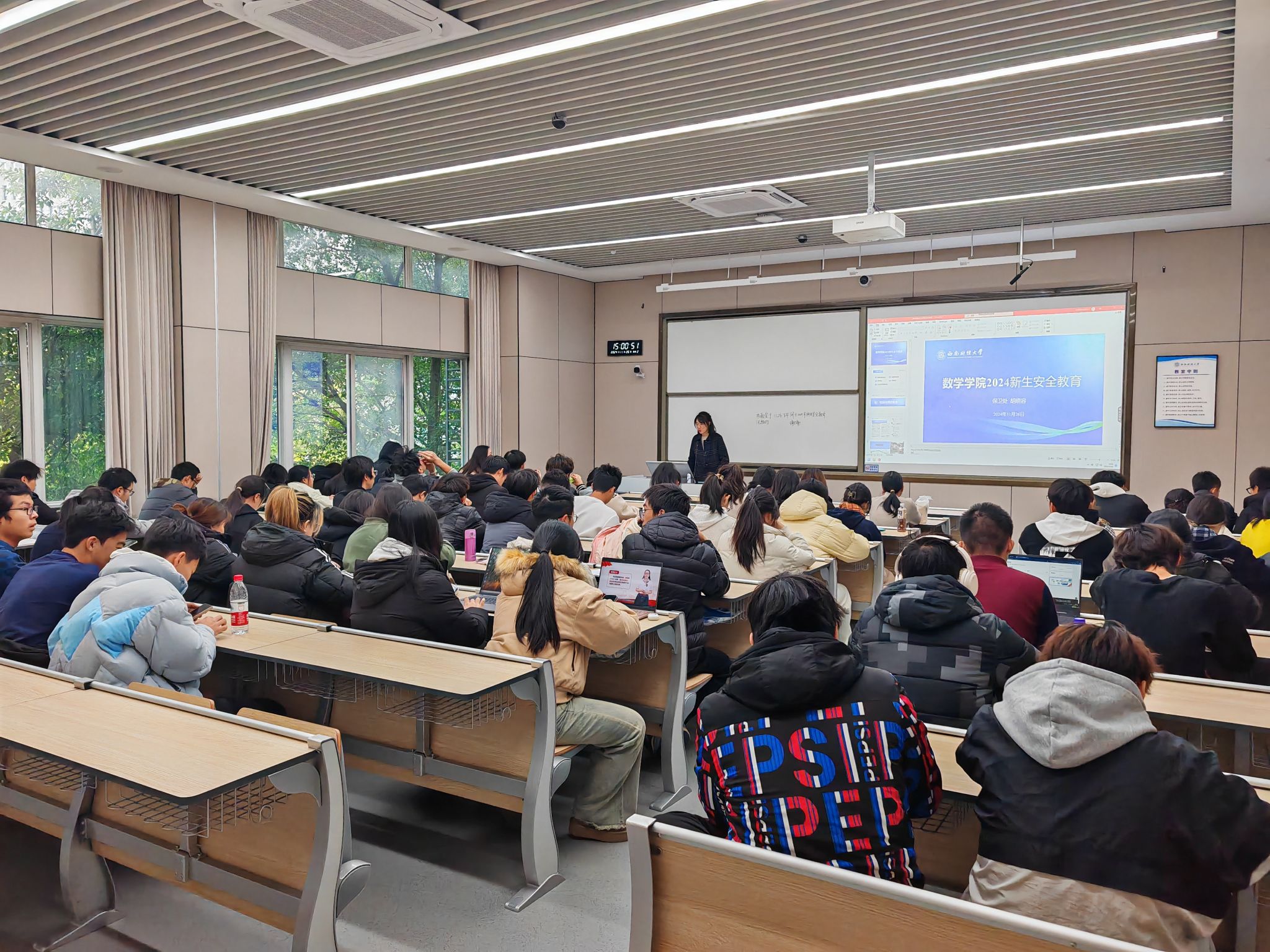 为切实提升新生安全意识与自我保护能力,助力其平安开启大学生活,11月26日,新葡的京集团8814vip在颐德楼H203教室为2024级新生举办了一场安全教育讲座。学校保卫处综合科科长胡晓容老师、2024级辅导员崔圣杰老师以及学院2024级学生共同参与了此次讲座。