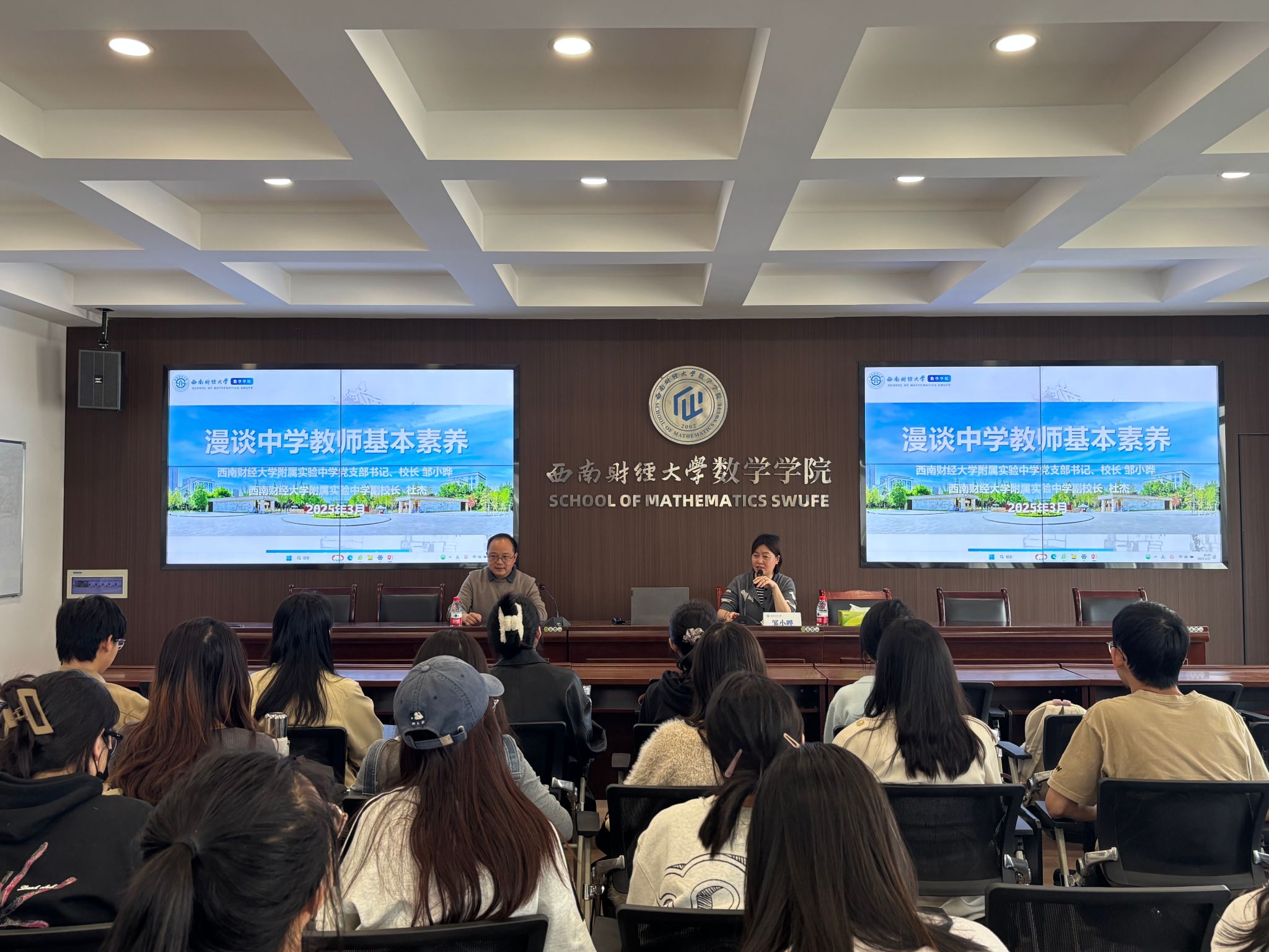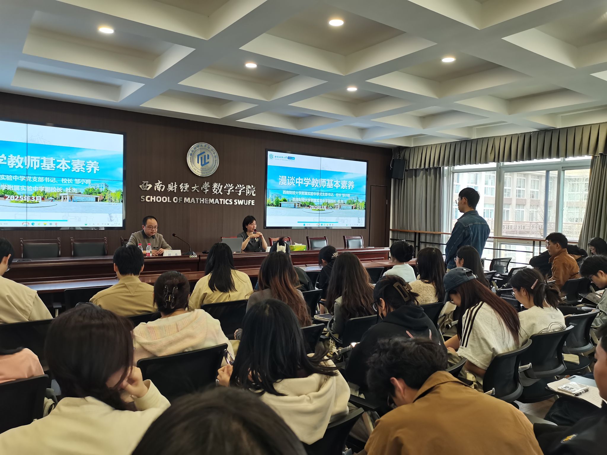 3月27日,新葡的京集团8814vip在通博楼b412会议室举办“中学教师基本素养与职业发展”主题讲座,特邀新葡的京集团8814vip附属实验中学校长邹小晔、副校长杜杰作主讲嘉宾,与学院数学专业研究生展开深入交流。