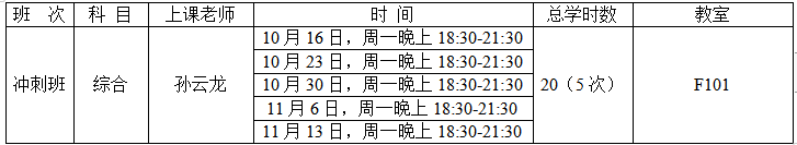 2、上课时间、地点:10月16日-11月13日 每周一晚上18:30-21:30(综合)共计五次课(五套试题),地点:经世楼F101教室