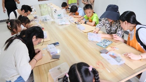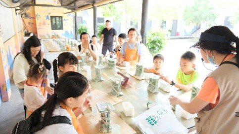 同时,为庆祝即将到来的第74个“六一”国际儿童节,学院工会还组织教职工子女参与了 “青铜小师傅DIY”课程,模拟青铜浇铸,体验文物修复及现场描金;以及 “古法制玉”和 “非遗拓画技艺”课程,做古蜀匠人,传承非遗文化。这些特色活动既有文化自信的高度,又贴合学生认知,让同学们在创作过程中充分感受到了以美育人的动人之处。
